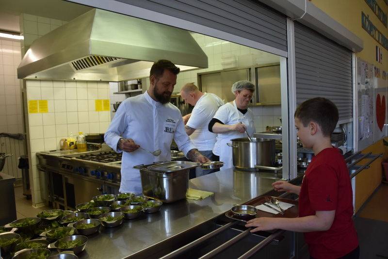 Kuharski mojster Bine Volčič je z osebjem šolske kuhinje pripravljal kosilo z ekološkimi sestavinami zadružnikov Pomurske ekološke zadruge.